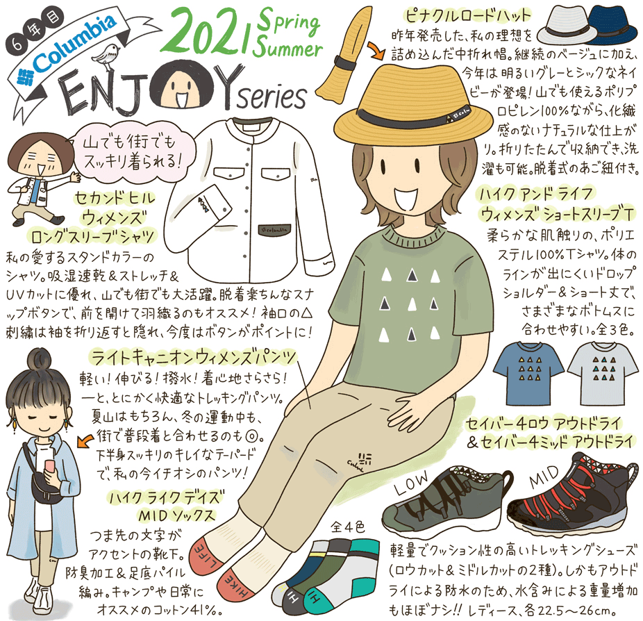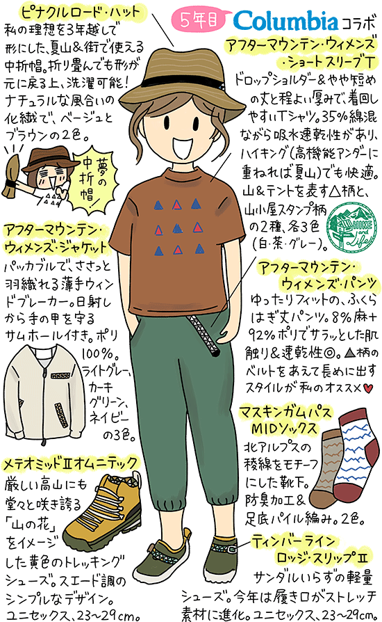 6年目となる【鈴木ともこ×Columbia】コラボの販売が始まりました。公式オンラインストアのほか、全国の直営店、アウトドアショップなどに順次並ぶ予定です。