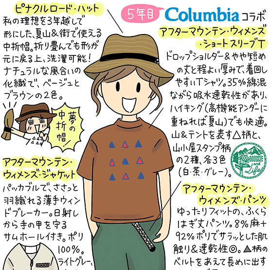 5年目となる【鈴木ともこ×Columbia】コラボの販売が始まりました。公式オンラインストアのほか、全国の直営店、アウトドアショップなどに順次並ぶ予定です。今年は、山でも街でも使える中折れ帽をラインナップしています。