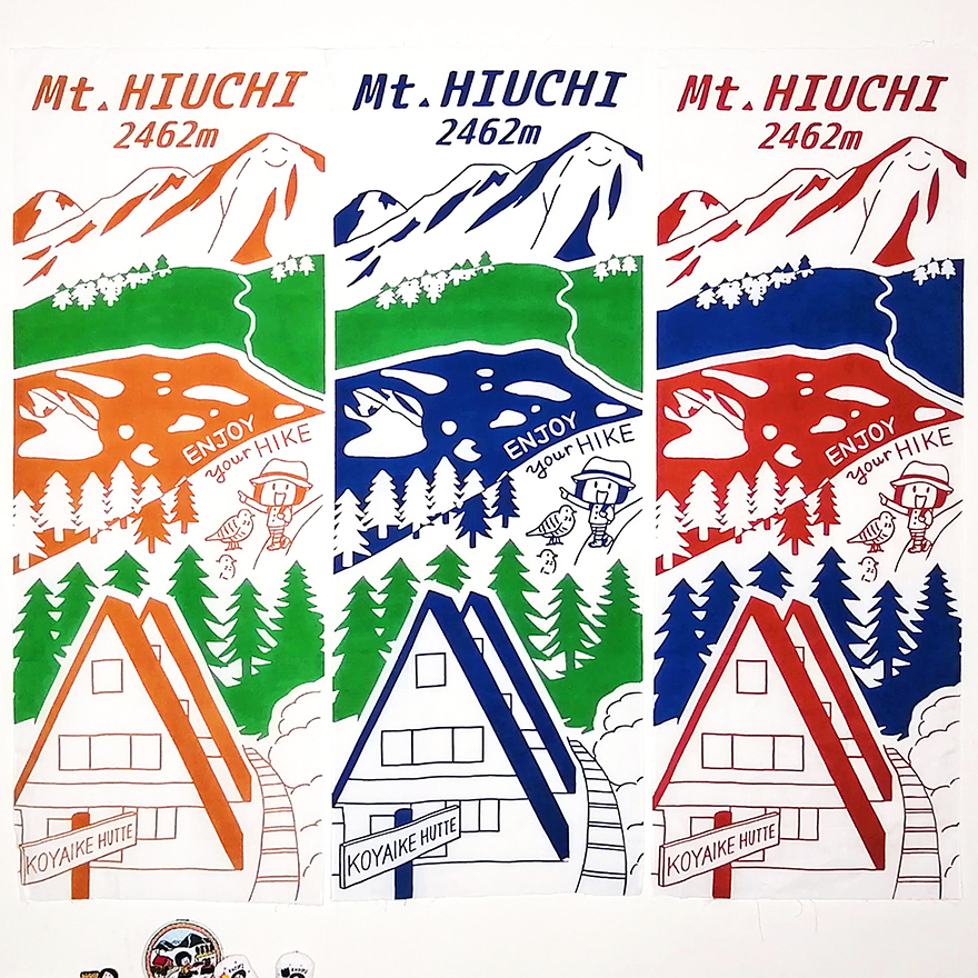 火打山と妙高山の登山拠点となる高谷池ヒュッテで、私のイラストを使った手ぬぐいが発売になりました。紅葉、盛夏、朝焼けをイメージした全3色のラインナップです。