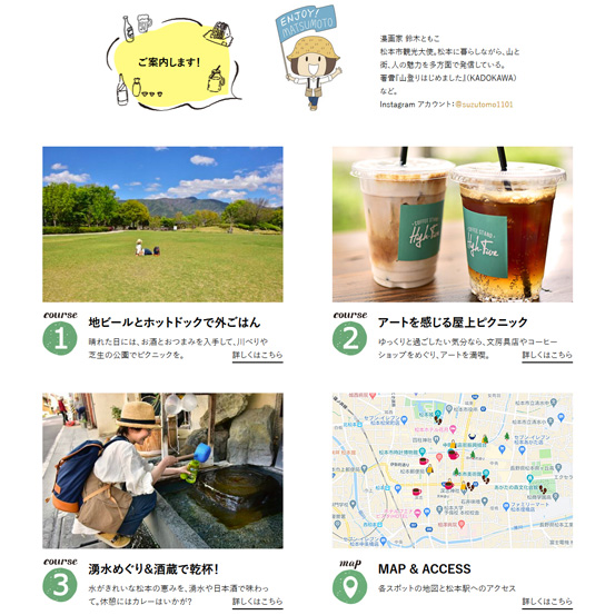 松本市公式観光サイト『新まつもと物語』にて、「鈴木ともこさんが提案 ちょっとディープな松本の歩き」(『ランドネ』誌面からの転載記事)が公開されています。