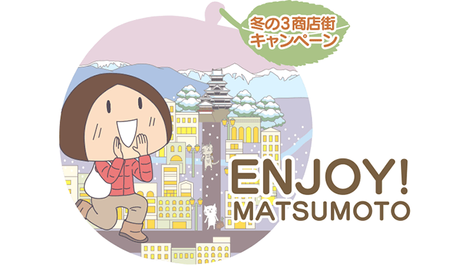 松本駅~松本城の大通りにある3つの商店街が実施する「ENJOY! MATSUMOTO」キャンペーンに、私のイラストを使ったロゴを提供いたしました。ロゴはWEBサイト、新聞広告、フライヤー(チラシ)、街路灯フラッグ、松本PARCOの外壁などに登場予定です。キャンペーンの中身は多岐にわたるのですが、私はロゴの他にも以下に協力しています。