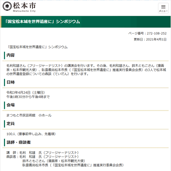- 松本市サイト:「国宝松本城を世界遺産に」シンポジウム