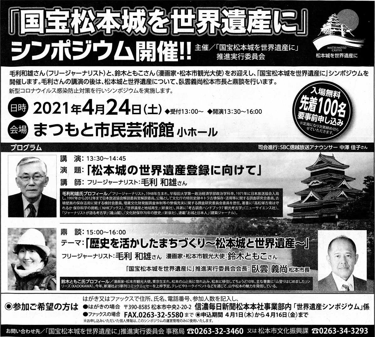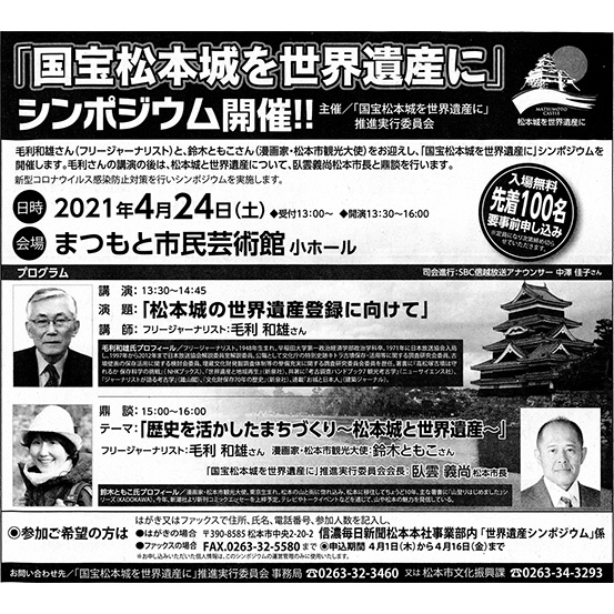 「国宝松本城を世界遺産に」推進実行委員会(事務局:松本市、信濃毎日新聞)が主催するシンポジウムに登壇いたします。シンポジウムは二部構成で、第一部はフリージャーナリスト・毛利和雄さんのご講演。第二部は毛利さん、松本市長の臥雲義尚さん、私の鼎談(トークセッション)です。参加費は無料です。