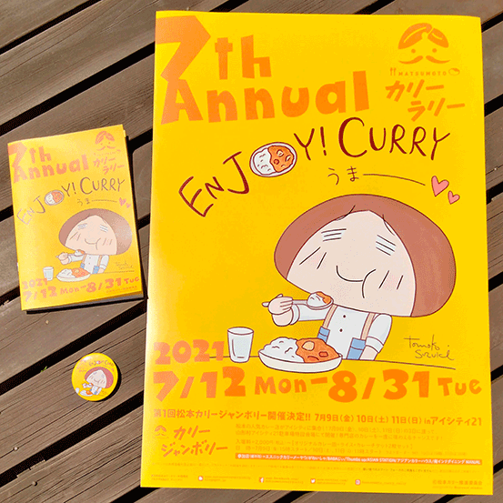 「第7回松本カリーラリー」のメインビジュアル用に、イラストを描き下ろしました。「松本カリーラリー」はカレーの食べ歩きスタンプラリーで、今年は90店舗が参加しています。イラストは、ポスター(参加店の目印)、冊子(参加店の紹介+スタンプ台紙。参加店で配布)、缶バッジ(スタンプ3個で先着300名様にプレゼント。受け渡しは2店舗のみ)に使われています。