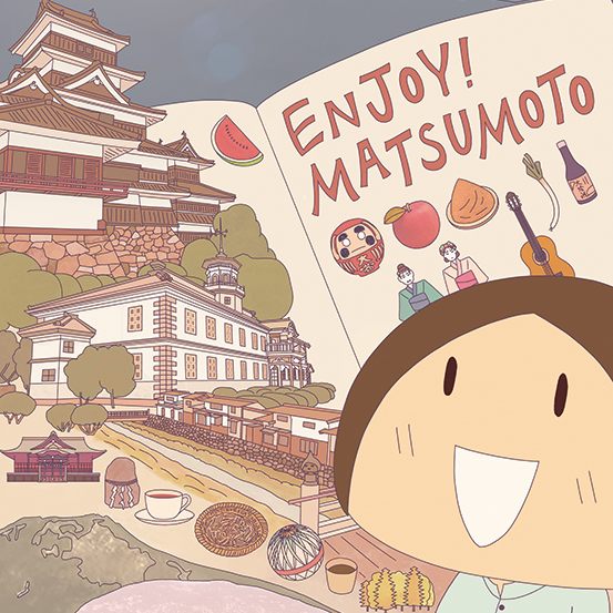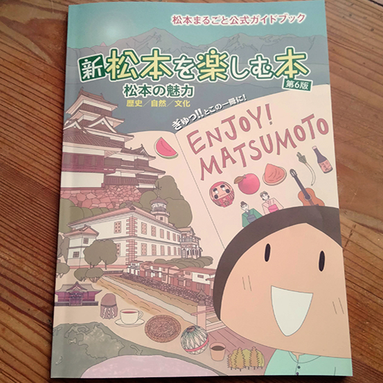 「新 松本を楽しむ本(第6版)」という書籍の表紙イラストを描きました。行政と連携して松本市の公式観光情報を発信する「新まつもと物語プロジェクト」が発行する公式ガイドブックで、松本の歴史や自然や文化が詰まった一冊です。松本市内のいくつかの書店、観光情報センター、松本城売店のほか、通販での購入が可能です。表紙の下に一列に並んでいるイラストは、四柱(よはしら)神社、牛つなぎ石、コーヒー、そば、松本てまり、つゆ、森、ともこで、その頭文字に私の思いを込めています。