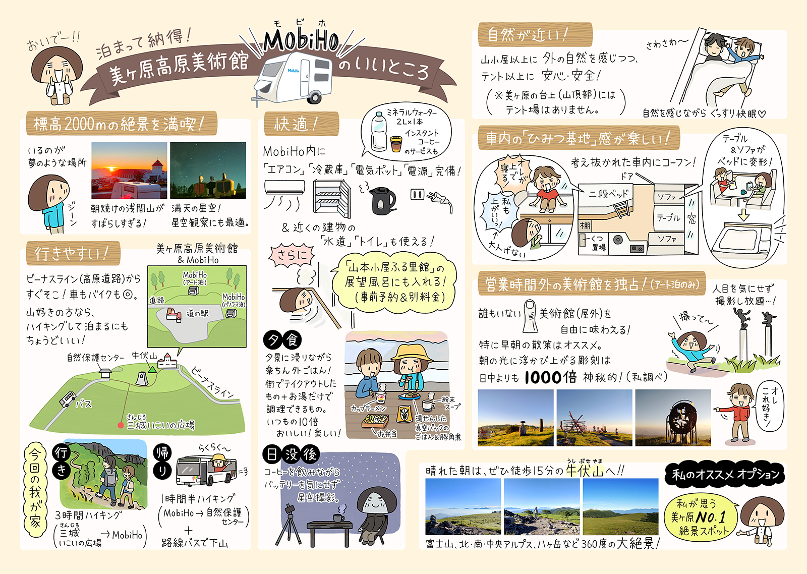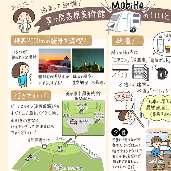 美ヶ原高原美術館の敷地内に、キャンピングカーを借りて宿泊できるMobiHo(モビホ)というサービスがあります。私自身が体験して、おすすめポイントをイラストにしました。美術館で配布中のチラシに掲載されているほか、レイアウトは変わりますがネットでも公開中です。