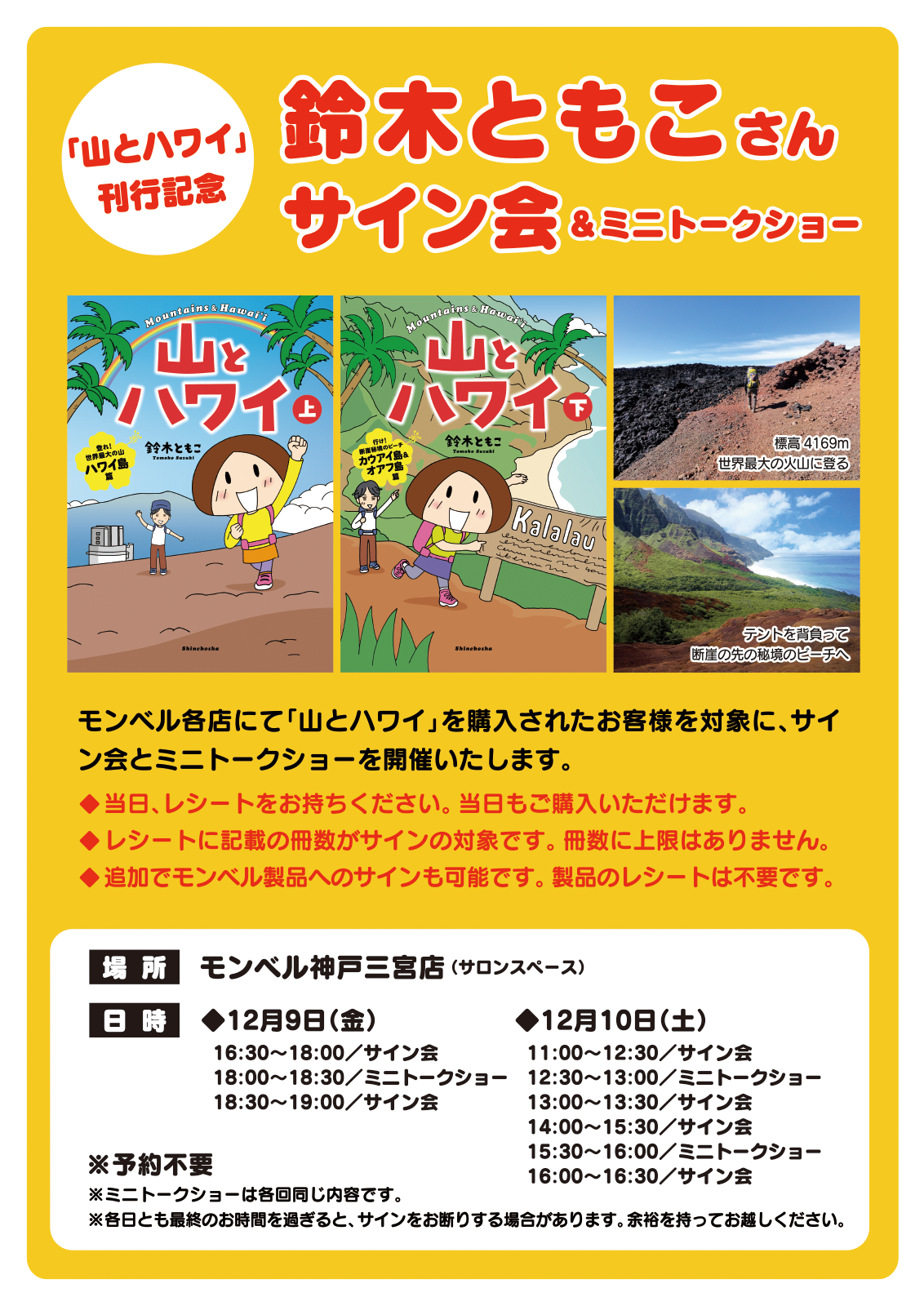 ※サイン会、ミニトークショーともレシートが必要です。モンベルストア各店にて『山とハワイ』をお買い求めいただいたレシートを、当日お持ちください。当日購入もできます。